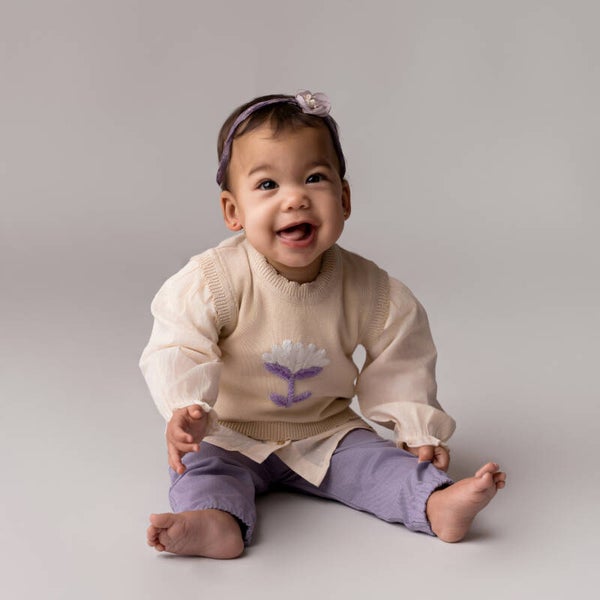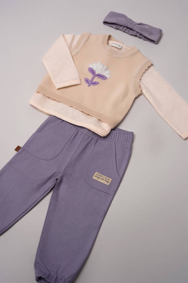 Leuk broekje in lavendel kleur met leuke voorzakjes erg leuk te combineren met Frogs & Dogs knitted spencer beige